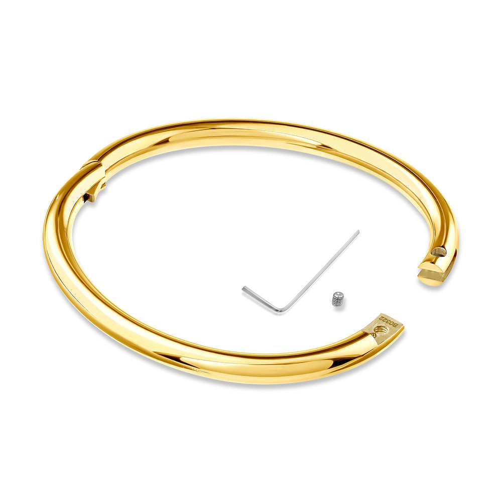 Finished in our high-quality gold finish, this ultra-slim locking oval wrist cuff is elegant and sophisticated. Measuring only 5mm in thickness and made from high-quality titanium, it has a fantastic, minimalist appearance that is lightweight and durable – and perfect for daily wear. With a discreet locking mechanism and vanilla appearance, you can wear this cuff 24/7 to symbolize your unbreakable bond.